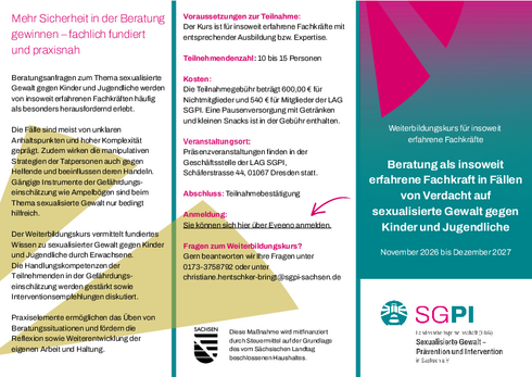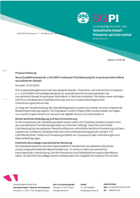 Als Landesarbeitsgemeinschaft Sexualisierte Gewalt - Prävention und Intervention in Sachsen e.V. (LAG SGPI) vertreten wir die Interessen von sächsischen Fachkräften und spezialisierten Fachberatungsstellen gegen sexualisierte Gewalt. Wir vertreten gleichzeitig die Interessen von Menschen, die von sexualisierter Gewalt bedroht oder betroffen sind sowie von deren Angehörigen. Wir verfolgen das Ziel, sexualisierte Gewalt sichtbar(er) zu machen und setzen uns für ein bedarfsgerechtes Versorgungsnetz in Sachsen ein, welches die Spezifik von sexualisierter Gewalt erkennt und dieser Rechnung trägt.